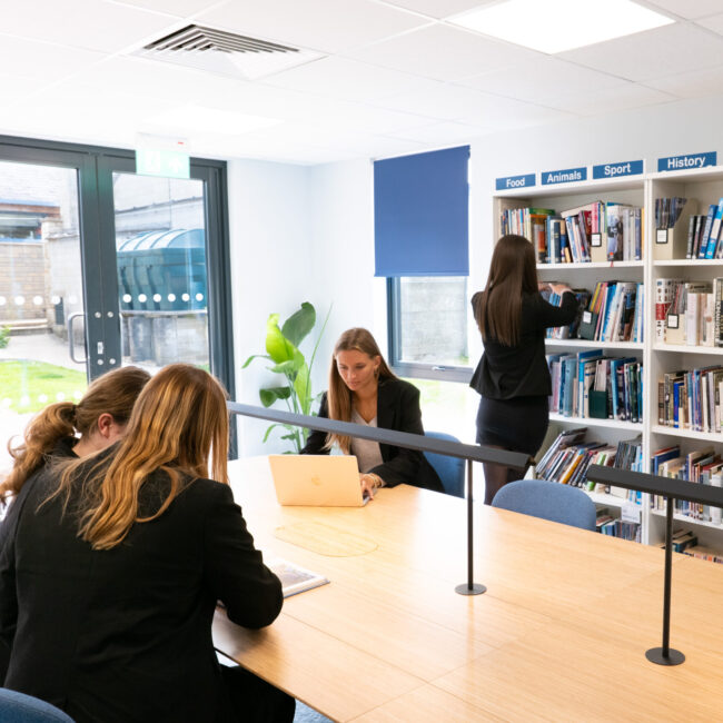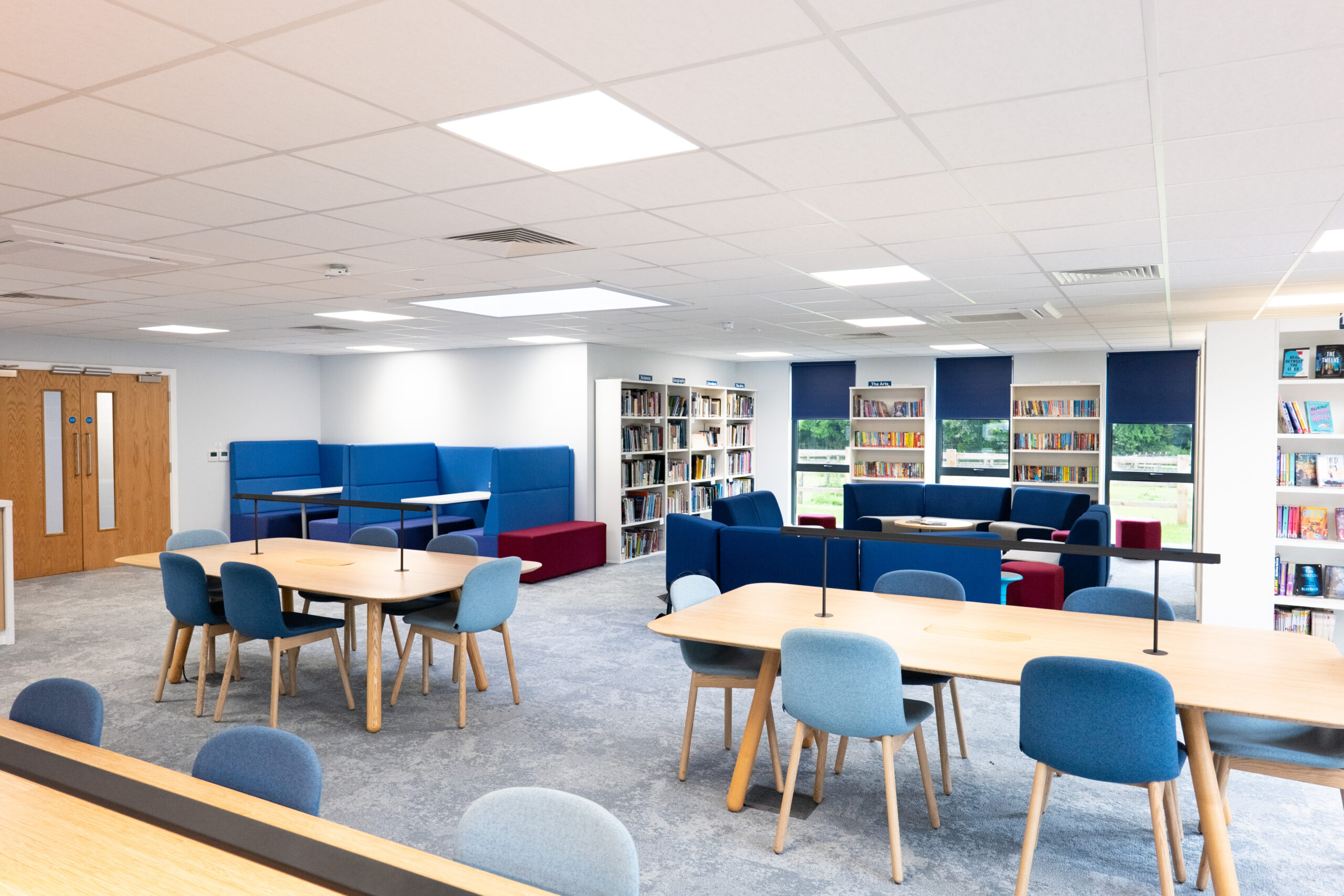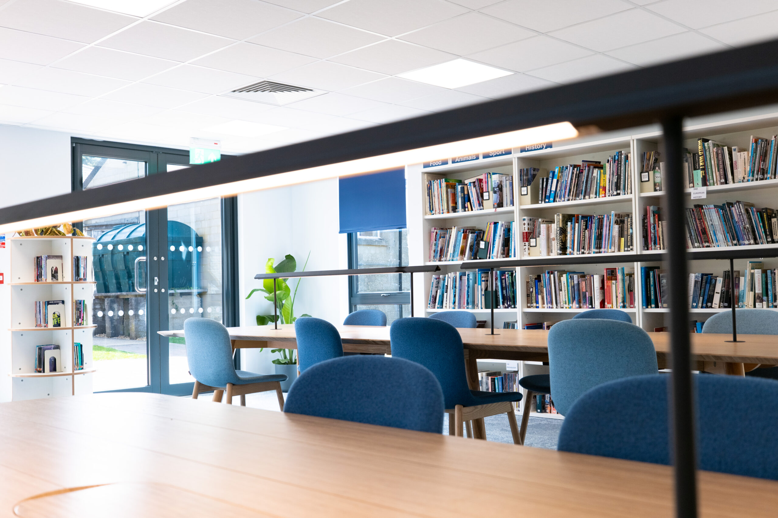 The library was transformed from a traditional, classroom-style space into a vibrant reading and study environment that reflects how students work today. The previous layout felt restrictive, with minimal natural light and uncomfortable furnishings that limited its use. The new modular building opens directly onto the outdoor terrace and uses large glazed panels to draw in daylight throughout the day. Inside, the library features zoned areas to support a mix of quiet study and group activity. Comfortable chairs, low-level bookshelves, and casual breakout seating give students freedom in how they use the space. The selection of soft blues and greys throughout helps create a peaceful atmosphere, while the use of curved furniture and soft textures breaks up the room into natural pockets of focus. LED lighting was installed with varied levels to support different tasks, and acoustic panels reduce echo, helping the space remain quiet even when multiple groups are present.