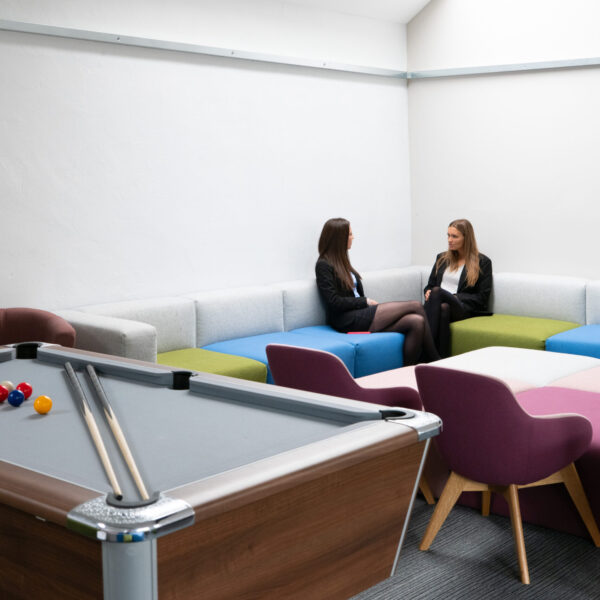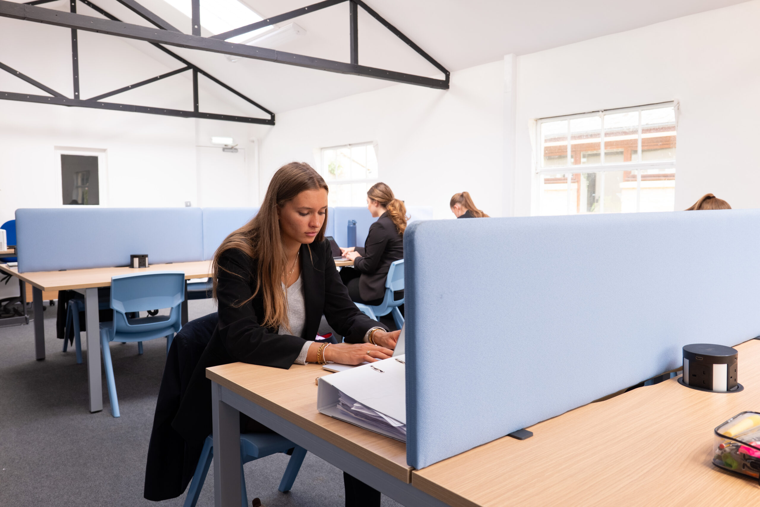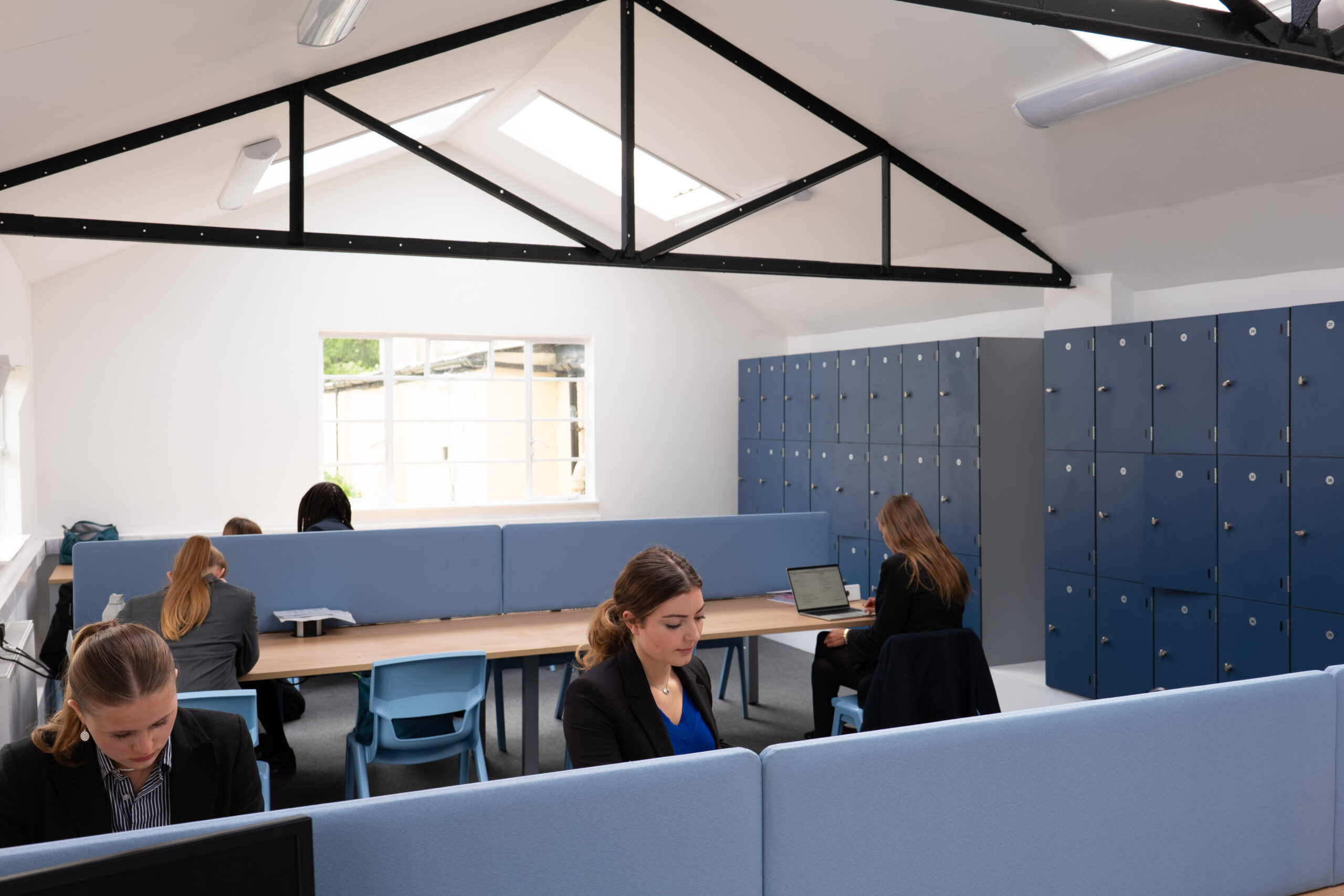 The new sixth form centre was created to gives older students a dedicated space to call their own. It was made as a modular, standalone building that gives students a clear sense of ownership and maturity. Inside, three key areas support different aspects of daily life: a social space, a study zone, and an informal games area. Each part was designed with input from staff and students to balance structure and comfort. The social space includes soft seating and breakout furniture where students can relax, talk, or work together between lessons. The study booths, located near large windows to maximise natural light, offer quieter seating with integrated power access for laptops and phones. In the centre, informal seating and a games table help create moments of community, especially at break times. Finishes across the building were selected for warmth, texture, and durability. Flooring, wall colours, and upholstery reflect the school’s character while helping students feel calm and focused. Acoustic considerations were also built in, creating a quieter atmosphere to support learning.