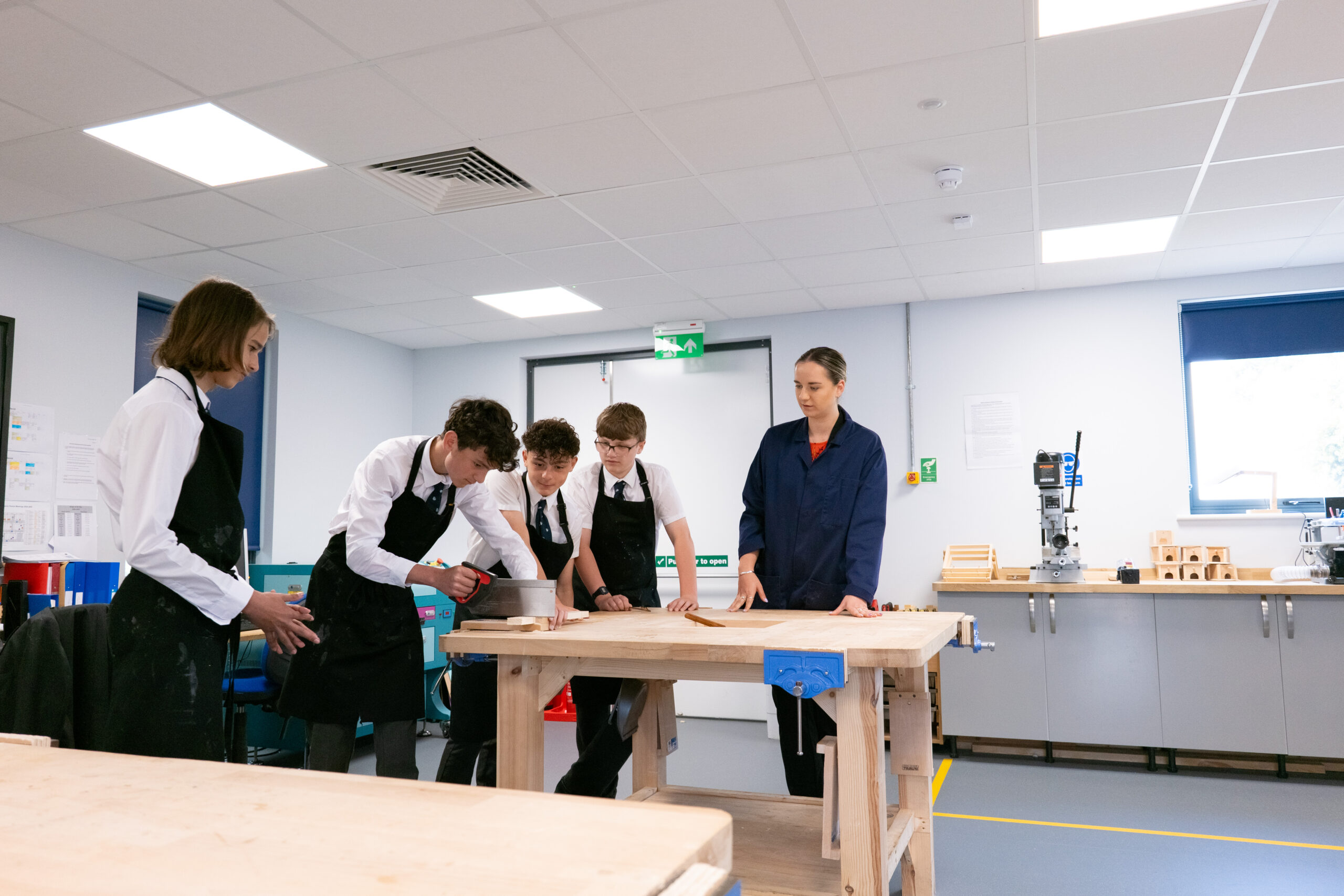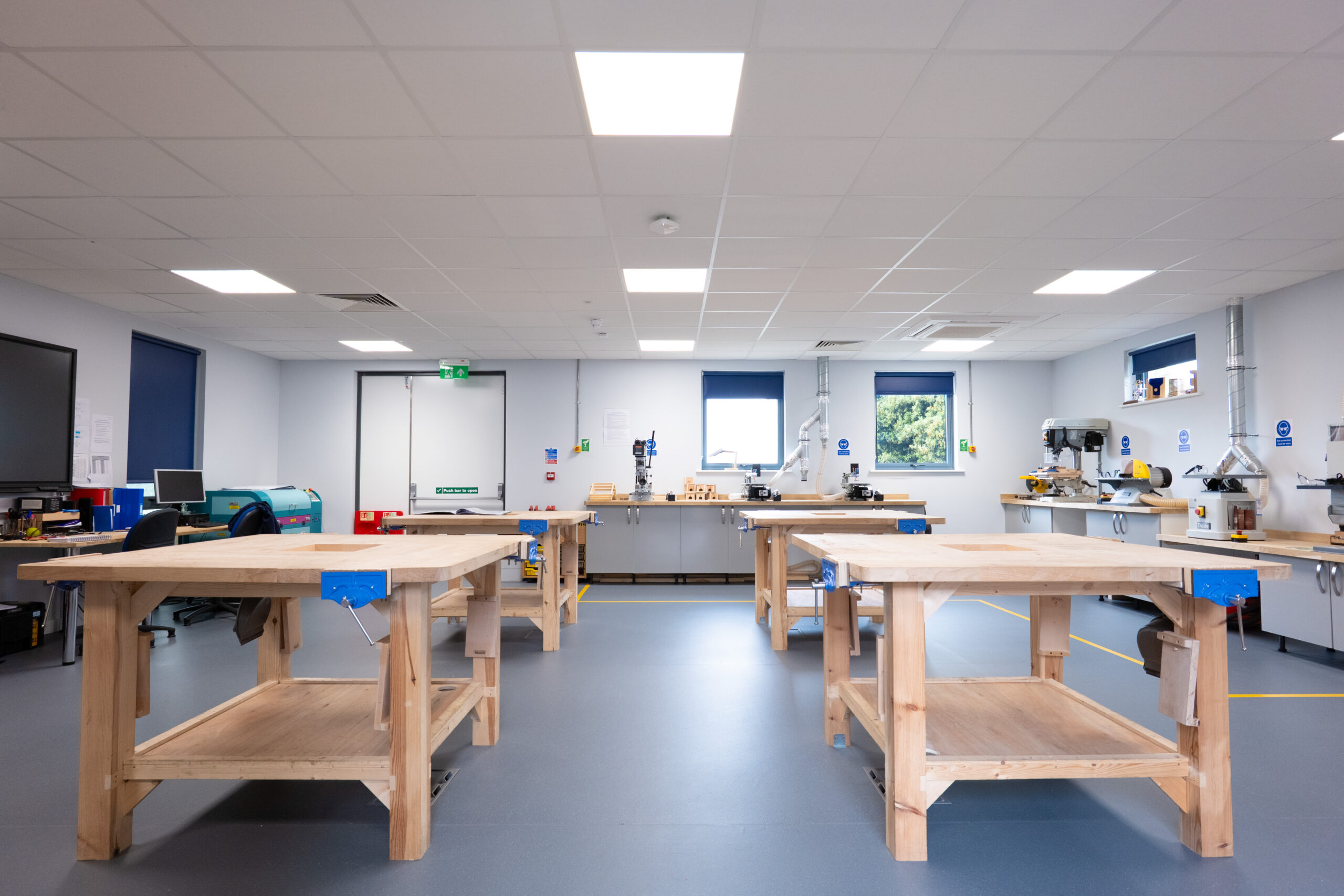 The new Design and Technology suite was built to give students more space, better access to equipment, and a more engaging environment for hands-on learning. The old room was too small and often overcrowded, limiting what could be taught and how comfortably students could work. Now, the modular building provides a spacious, purpose-built layout that supports both individual workstations and group demonstrations. Fixed benches line the perimeter, while freestanding worktables can be reconfigured depending on class size or project. Integrated storage for tools and materials keeps the space organised and adaptable. Special attention was paid to ventilation, lighting, and safety. The new workshop includes robust flooring, fire-resistant materials, and ample power and data points. The large windows and skylights not only support visibility but help maintain an open, comfortable feeling in a room where students are often concentrating on detailed tasks.